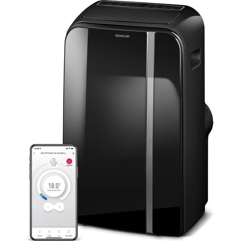 mobilní klimatizace • výkon chlazení 12 000 Btu/h • pro prostor do 47 m² • příkon 1 450 W • průtok vzduchu max. 420 m³/hod • energetická třída A • hlučnost 63 dB • funkce odvlhčování • dálkové ovládání v balení • regulace teploty 17 až 30 °C • 4 úrovně rychlosti • 3 režimy provozu • ovládací panel s LED displejem • Wi-Fi • ovládání přes aplikaci Sencor HOME • 24h časovač • noční režim spánku • 1 000ml zásobník na kondenzát s funkcí samoodpařování • 4 pojezdová kolečka • integrovaná rukojeť • 210g ekologického chladiva R290 bez emise skleníkových plynů